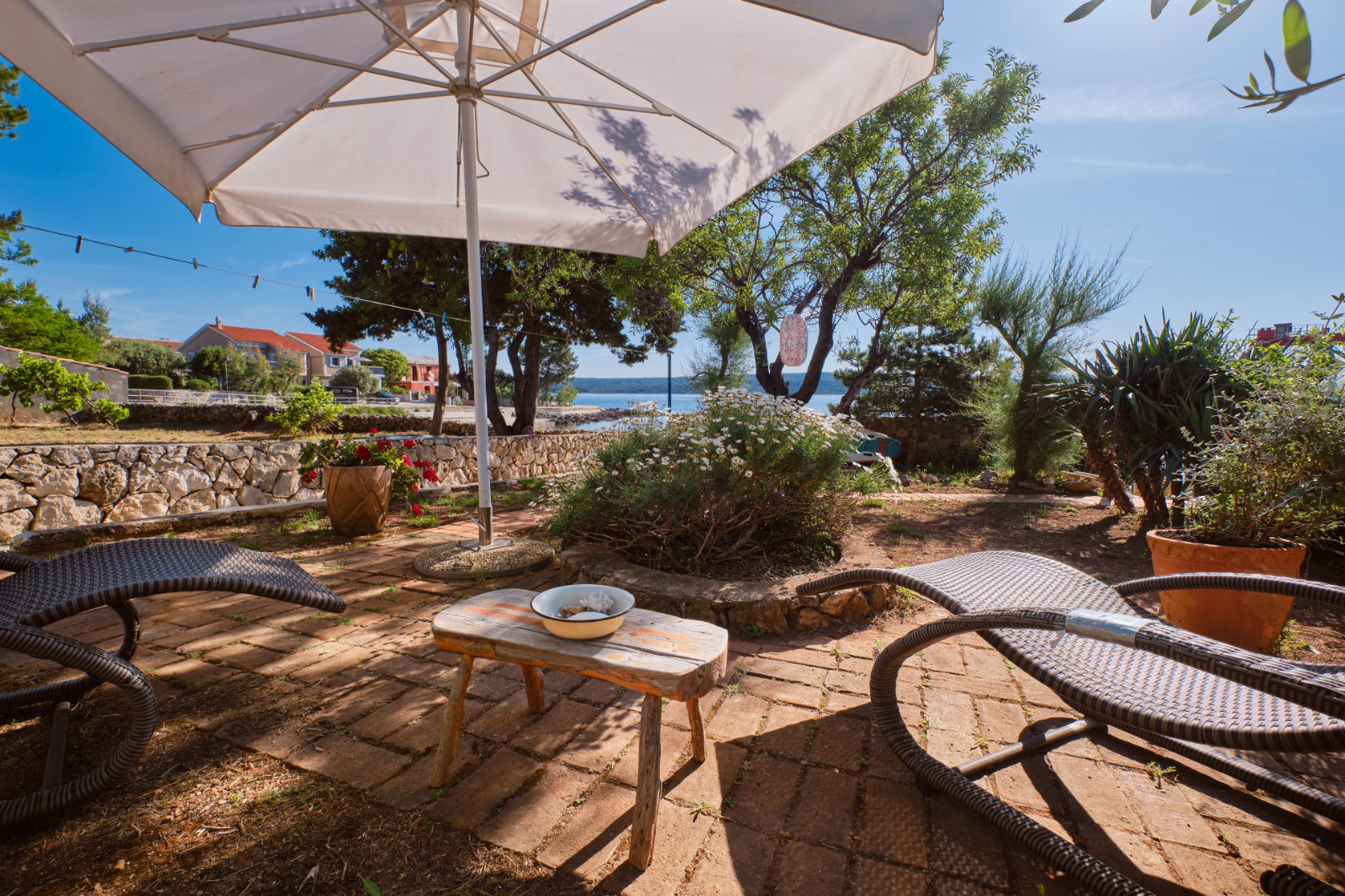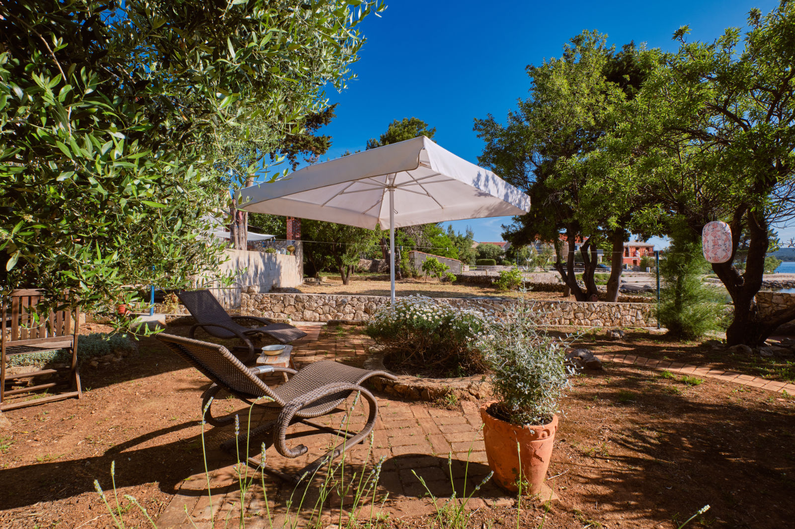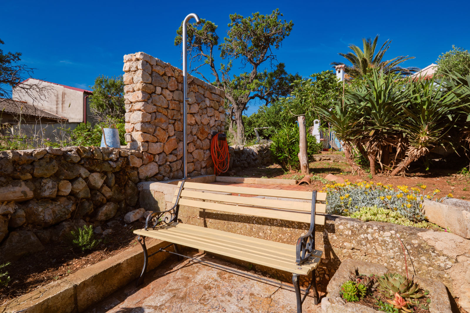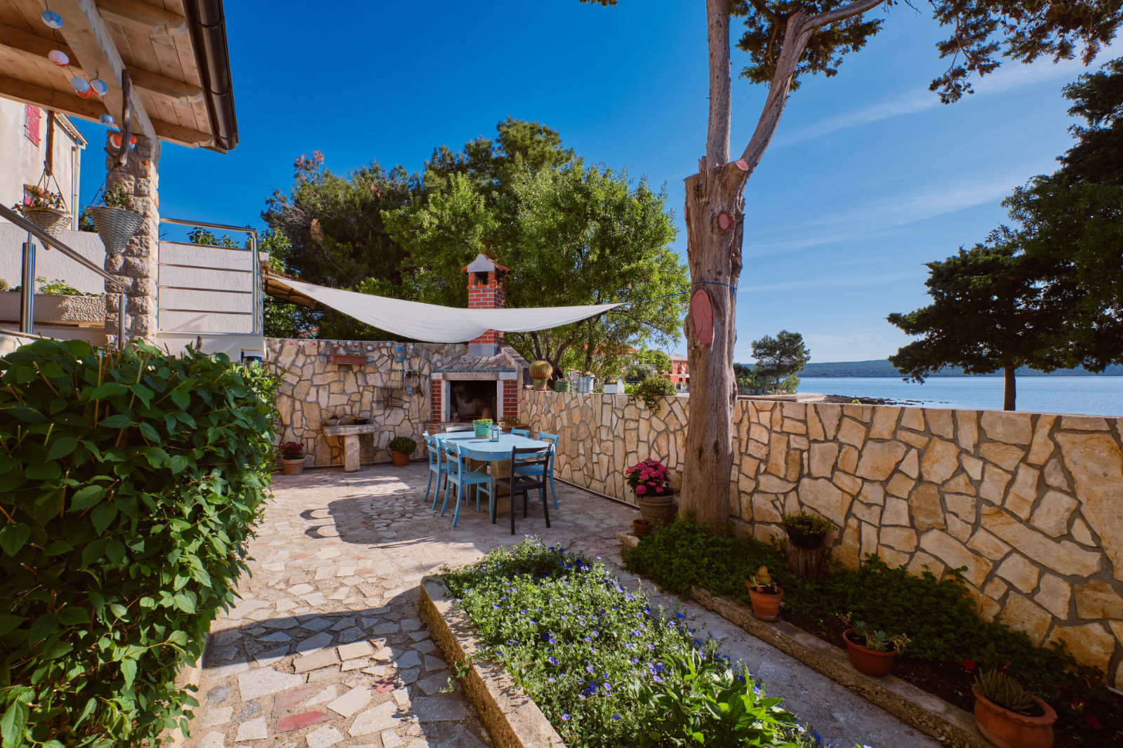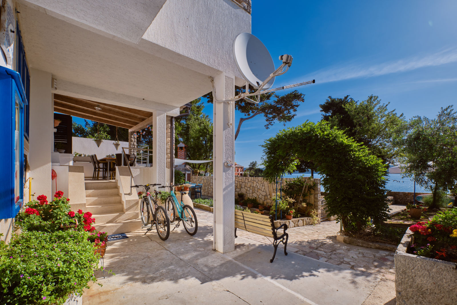 Around the house there is a yard of 700 m² with parking, front and back yard with Mediterranean plants and terraces with sea view and two outdoor barbecues. From the garden there are stairs leading directly to the sea. In the garden, next to the exit to the sea, there is an outdoor shower which offers to the guests a refreshment on their return from the beach.