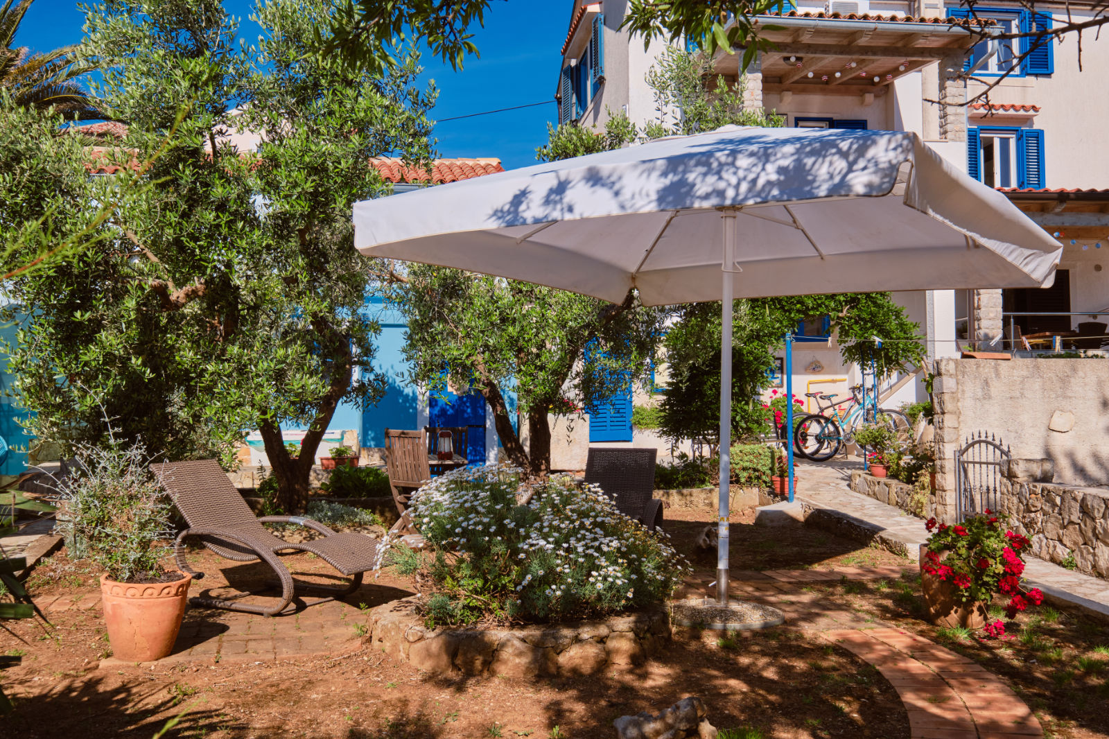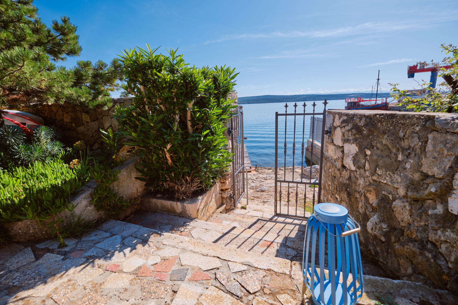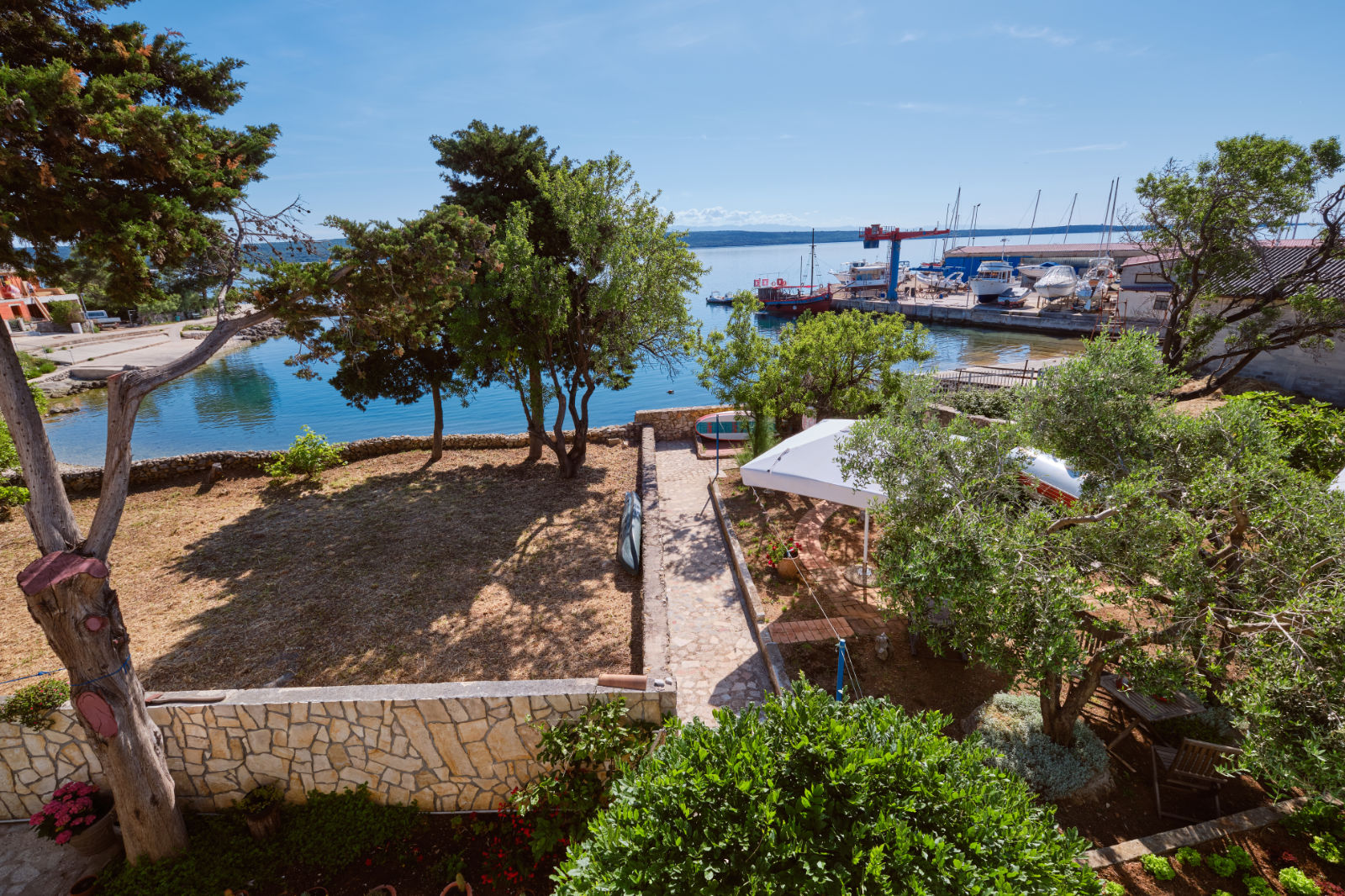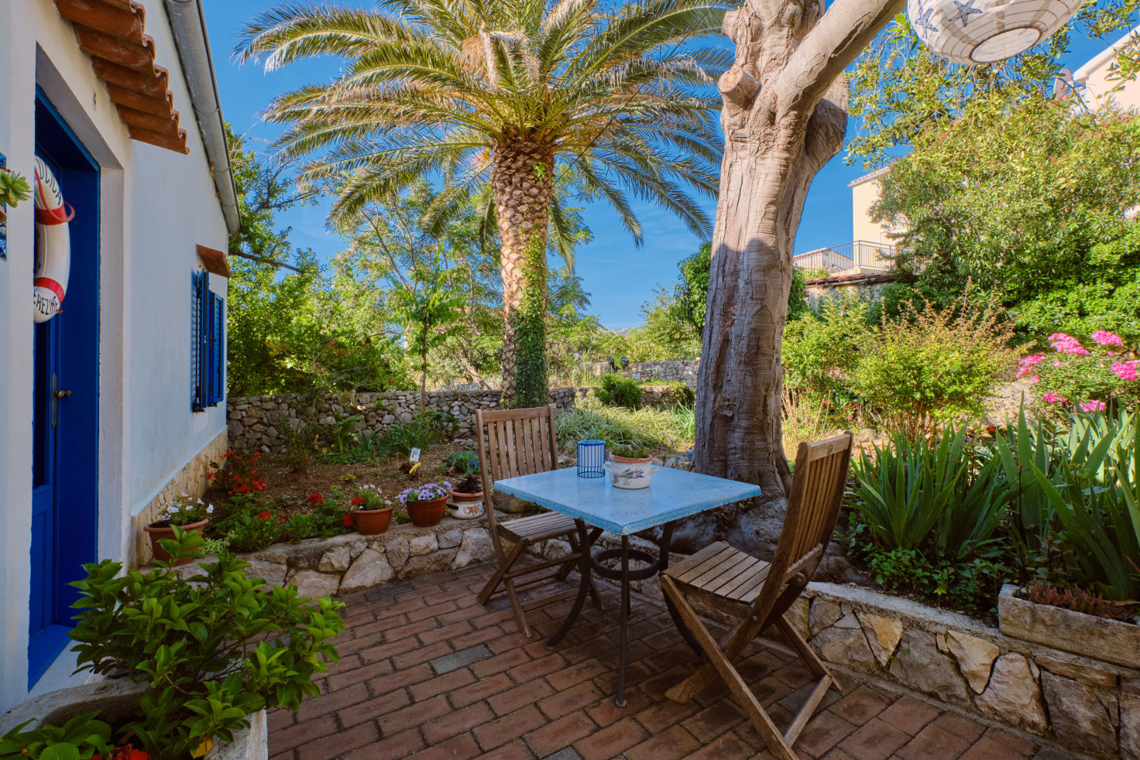 Around the house there is a yard of 700 m² with parking, front and back yard with Mediterranean plants and terraces with sea view and two outdoor barbecues. From the garden there are stairs leading directly to the sea. In the garden, next to the exit to the sea, there is an outdoor shower which offers to the guests a refreshment on their return from the beach.