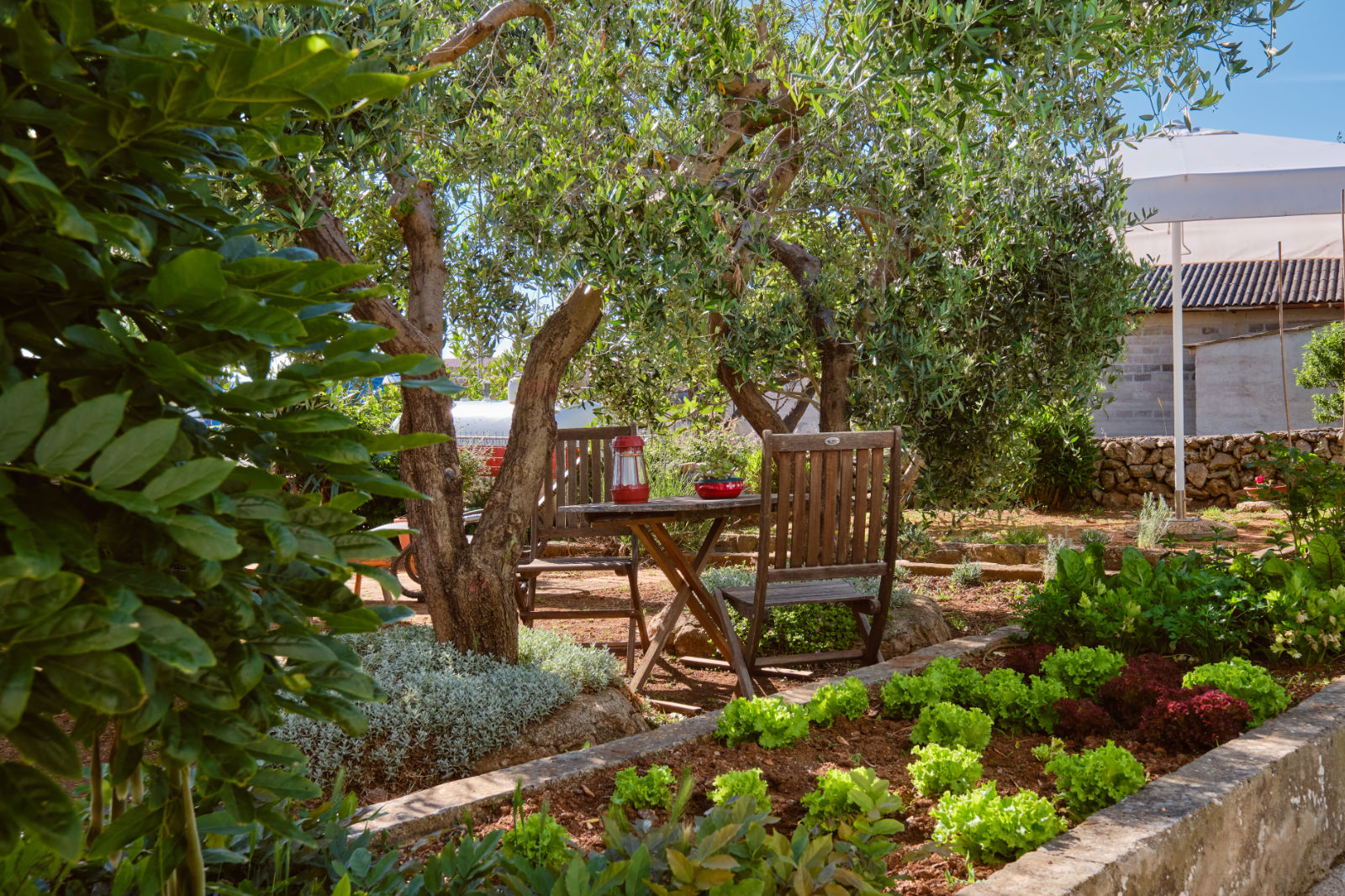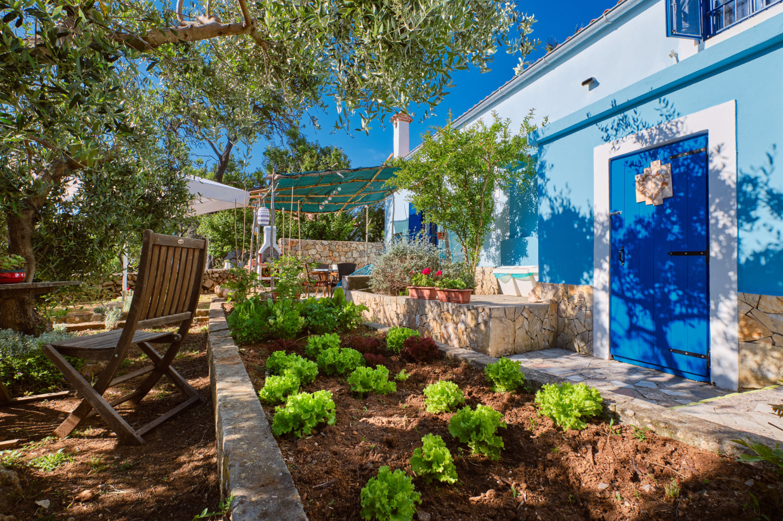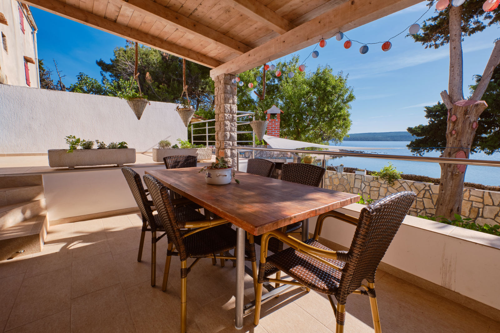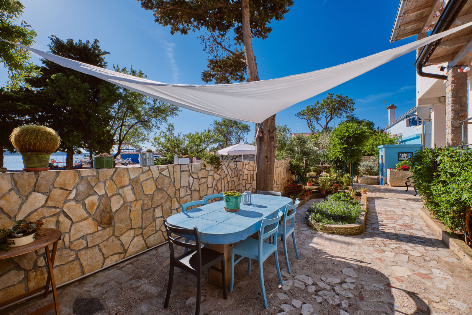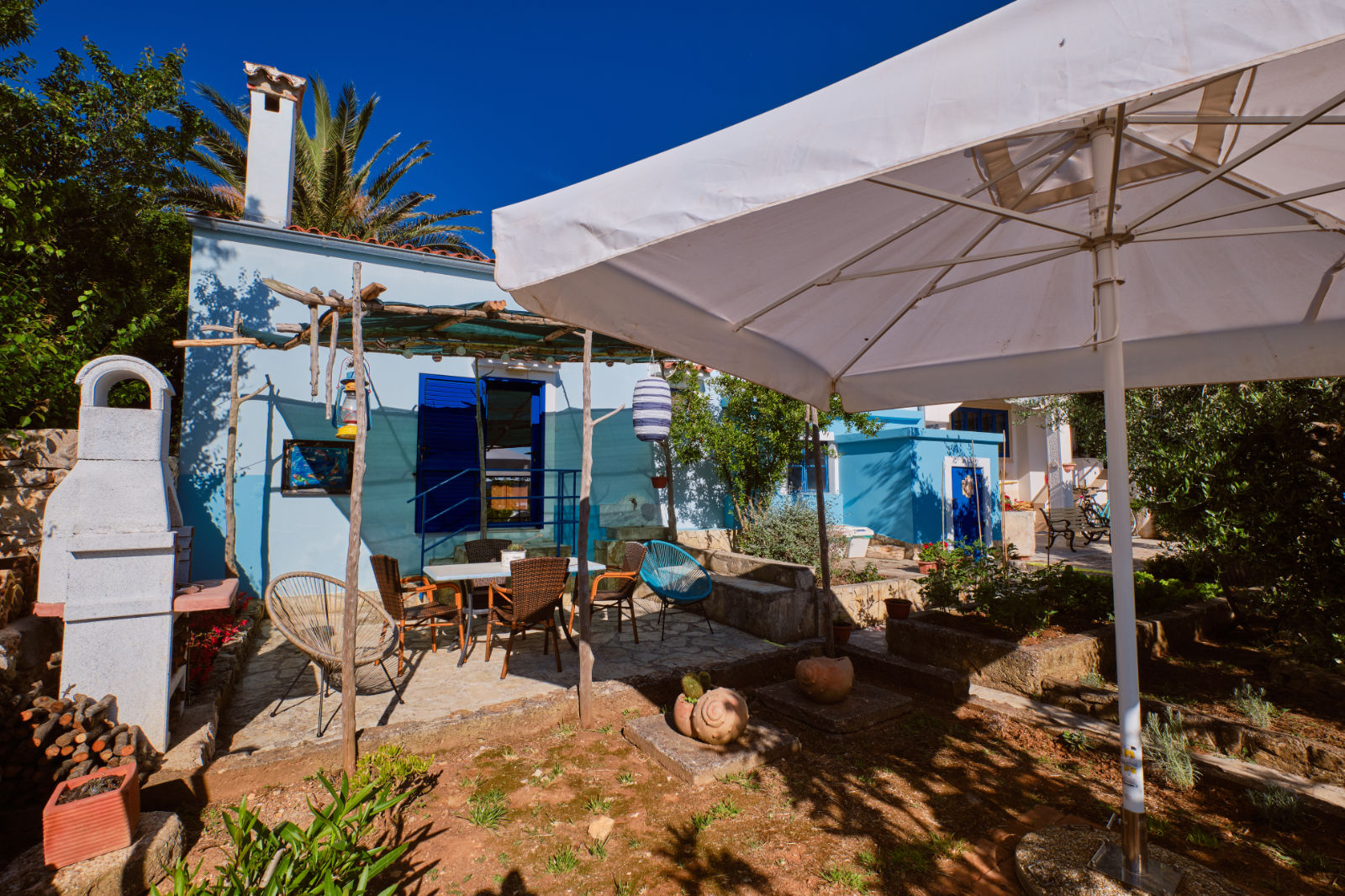 Around the house there is a yard of 700 m² with parking, front and back yard with Mediterranean plants and terraces with sea view and two outdoor barbecues. From the garden there are stairs leading directly to the sea. In the garden, next to the exit to the sea, there is an outdoor shower which offers to the guests a refreshment on their return from the beach.